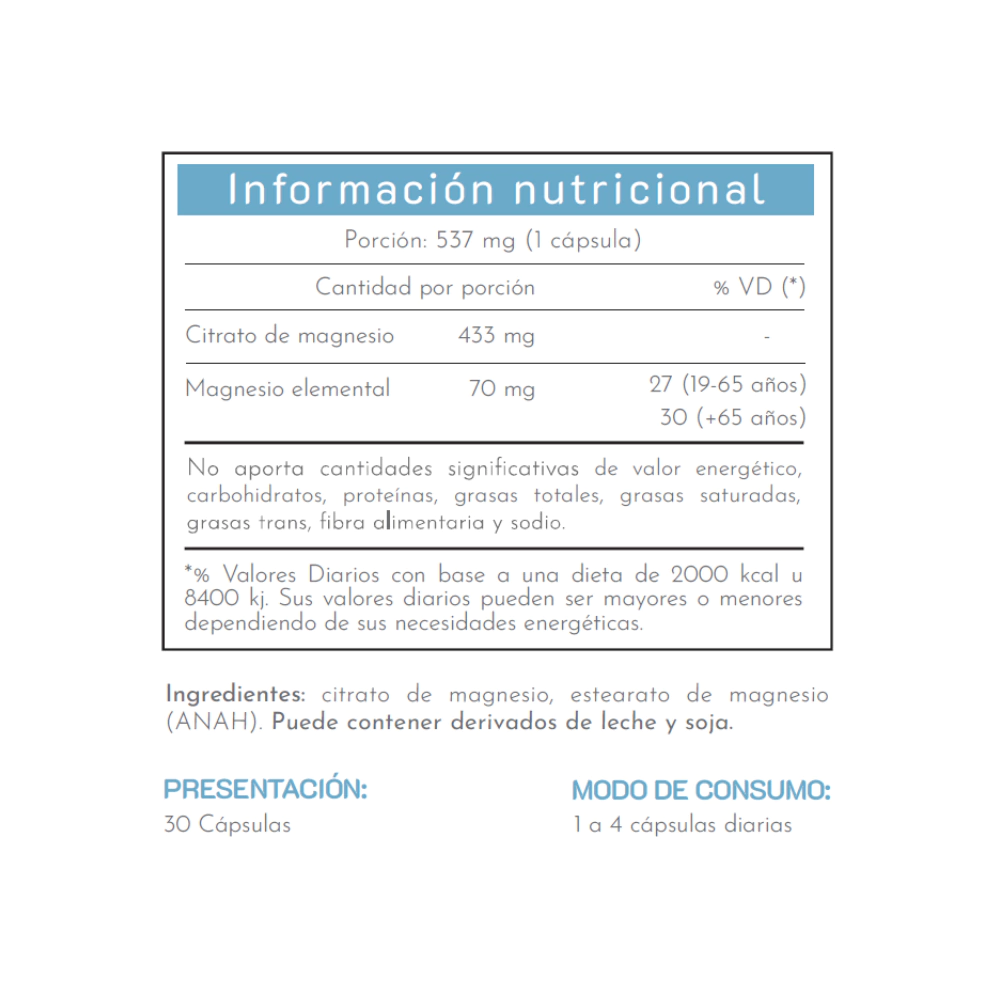 Citrato de Magnesio de Natuliv aporta más de 400 mg de citrato de magnesio, lo que equivale a 70 mg de magnesio elemental.
